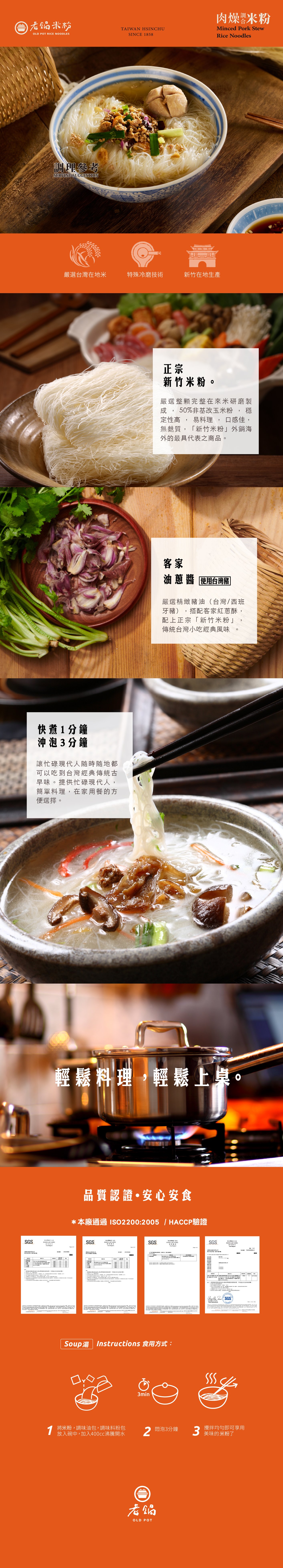 Instant rice noodles made of 50% rice, cornstarch and flour, with traditional Taiwanese broth. Non-fried, no preservatives added. Convenient and delicious!