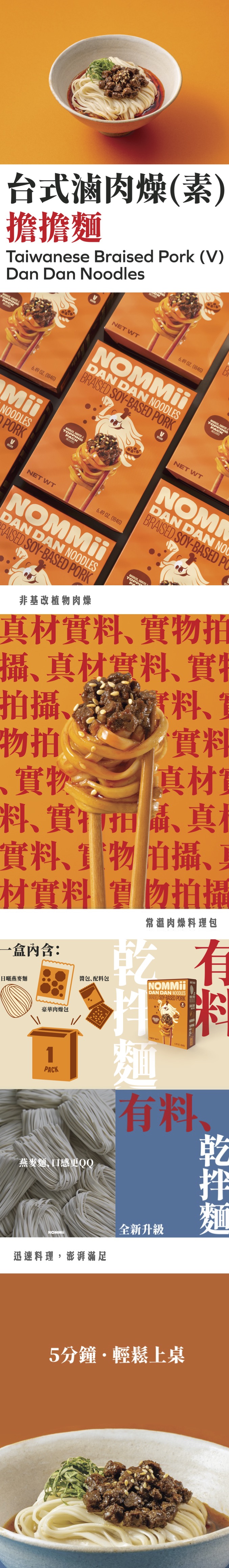 Q彈有勁的台灣燕麥麵,富含膳食纖維;搭配花椒香麻的川味擔擔醬與台式植物肉燥,